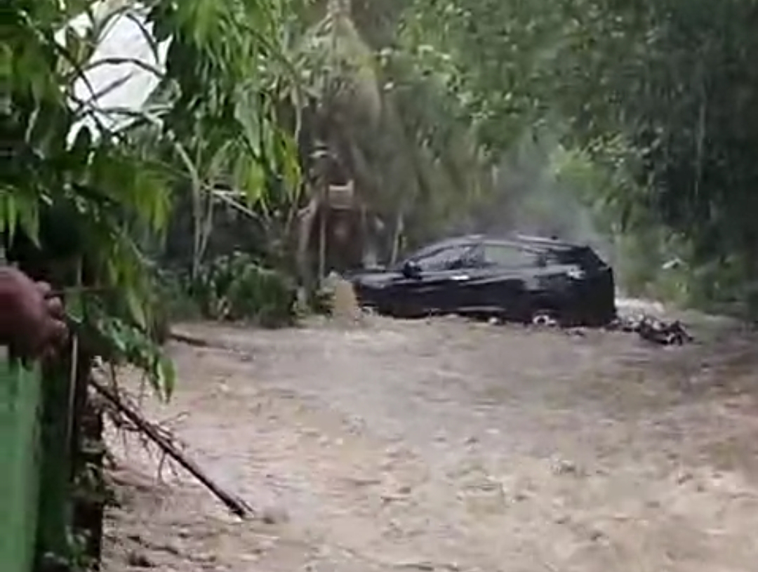 Dalam sebuah video yang beredar, sebuah mobil milik warga terseret air besar di kawasan Banjar Bengkel, Antiga.