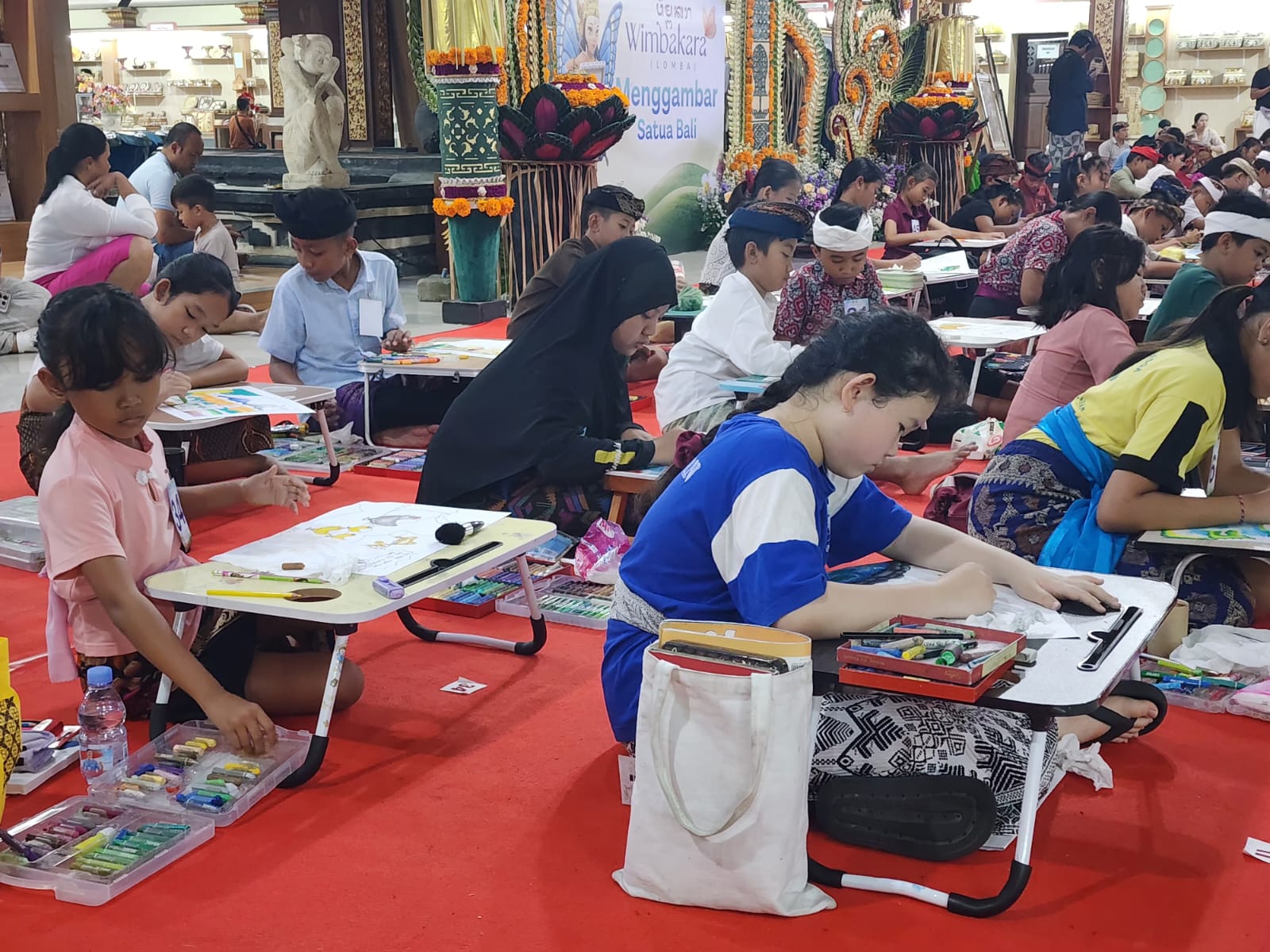 Kreativitas dan imajinasi anak-anak Sekolah Dasar (SD) memenuhi Lantai I Gedung Ksirarnawa, Taman Budaya Bali, pada Rabu (4/2/2026). Ratusan pelajar ini berkompetisi dalam Wimbakara (lomba) Melukis Satua Bali yang digelar sebagai rangkaian perayaan Bulan Bahasa Bali VIII Tahun 2026.