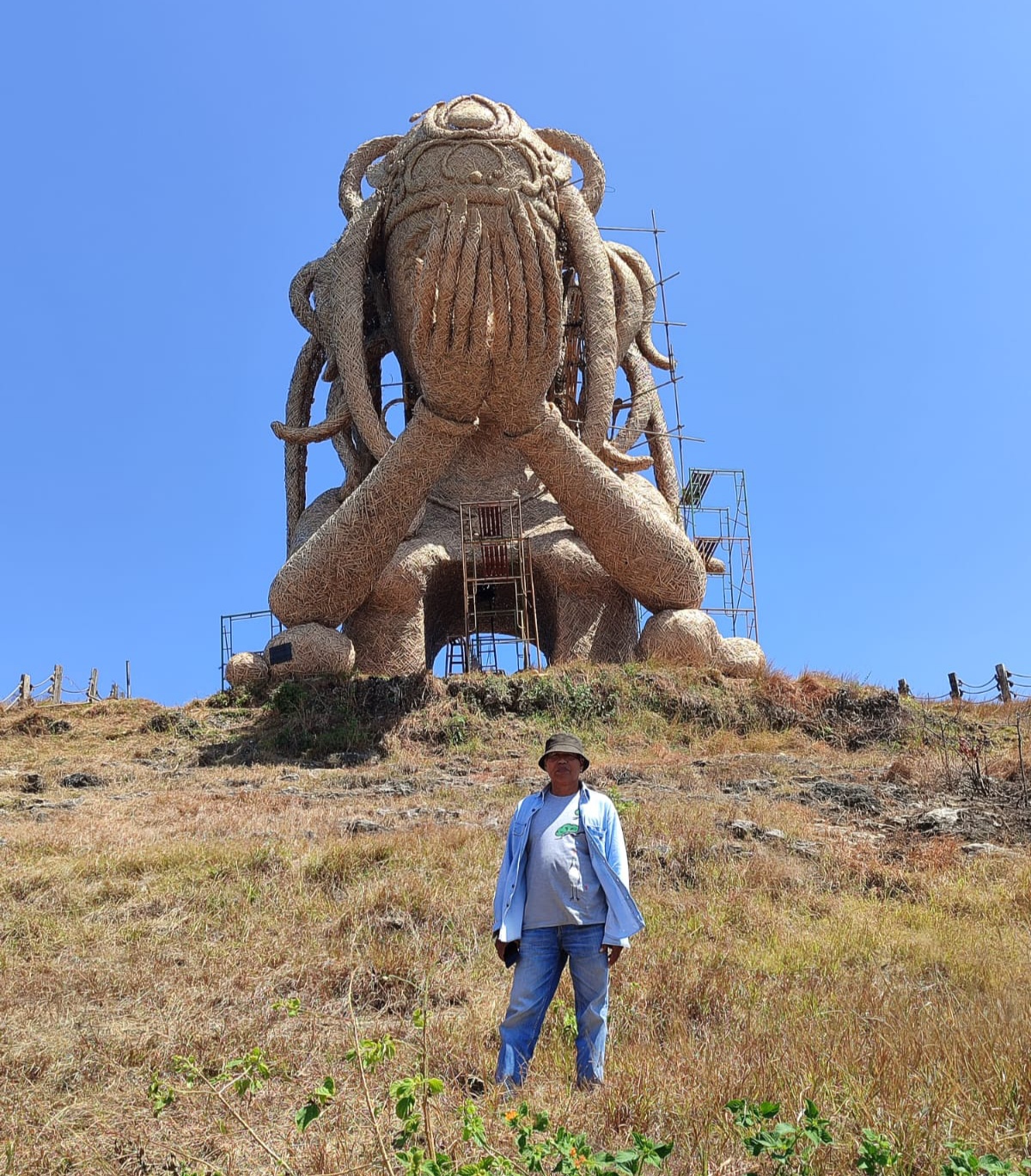 Di sisi kiri, di ketinggian bukit mungil, menjorok ke tepi laut, berdiri patung bambu mengusik mata. Dilihat dari mana pun patung ini terlihat fantastis, unik, simbolik, menatap sayu. Sekilas terlihat tidak menyentuh tanah, seperti alien turun ke bumi. Entah, patung ini tak cuma menjadi ”ratu” baru di pulau tandus, akan tetapi; ikon simbolik tak mudah dibaca awam. Gagasan otentik dalam sublimasi estetik – filosofi yang dibadankan. Hadir tak cuma memantik daya pukau, akan tetapi menjadi ’iklan” gratis pulau gersang. Selayak elit di Klungkung berterima kasih pada seniman muda ini. Tayangan-tayangan media sosial patung ini ditonton jutaan netizen.